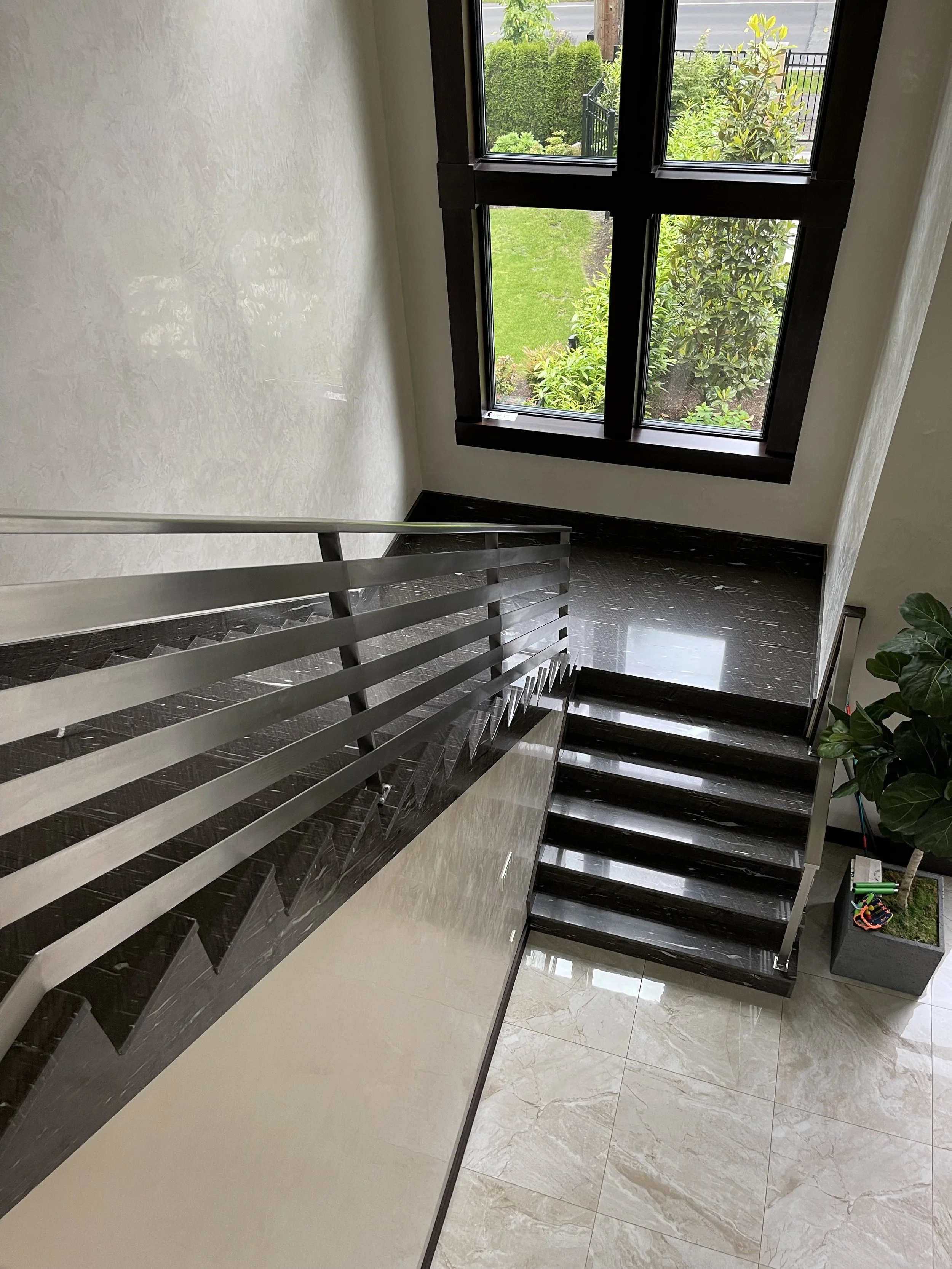 Custom residential stone stair fabrication in Bellevue, featuring precision-cut treads, matching risers, and flawless geometric transitions.