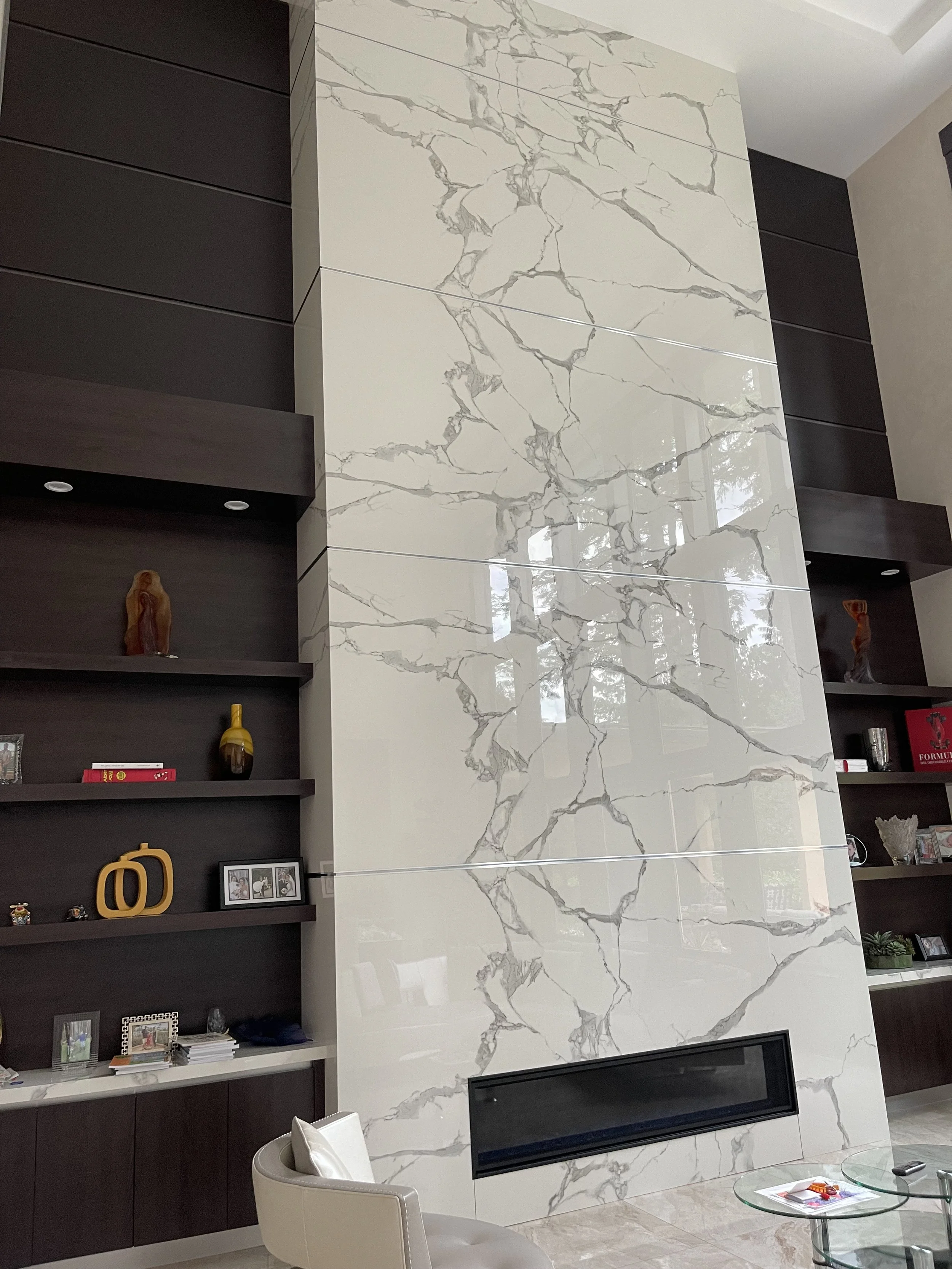 A double-height architectural fireplace installation in Bellevue, featuring large-format tile engineered for a seamless vertical transition.