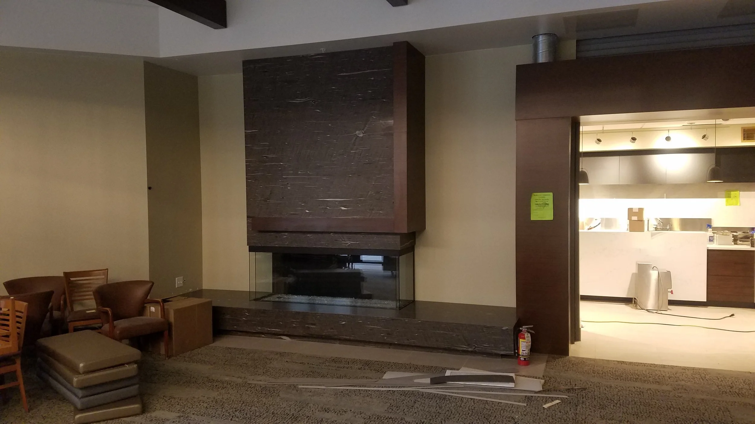 A heavy-profile stone fireplace surround with custom mitered drop edges, anchoring a commercial lounge space at the Pro Medical building in Bellevue.