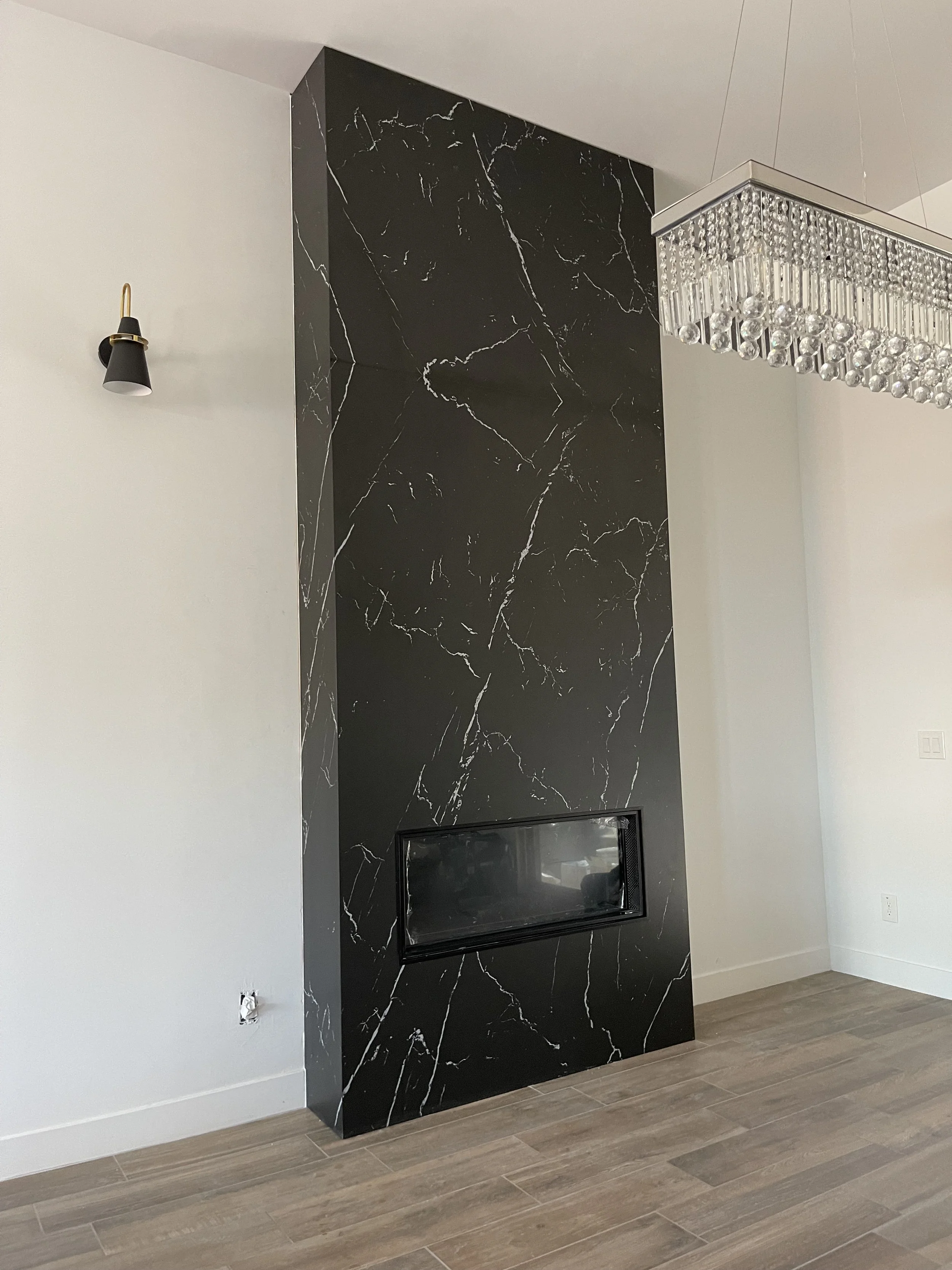 A custom floor-to-ceiling fireplace surround in striking black quartz, featuring a modern flush-mount installation and precise edge returns.