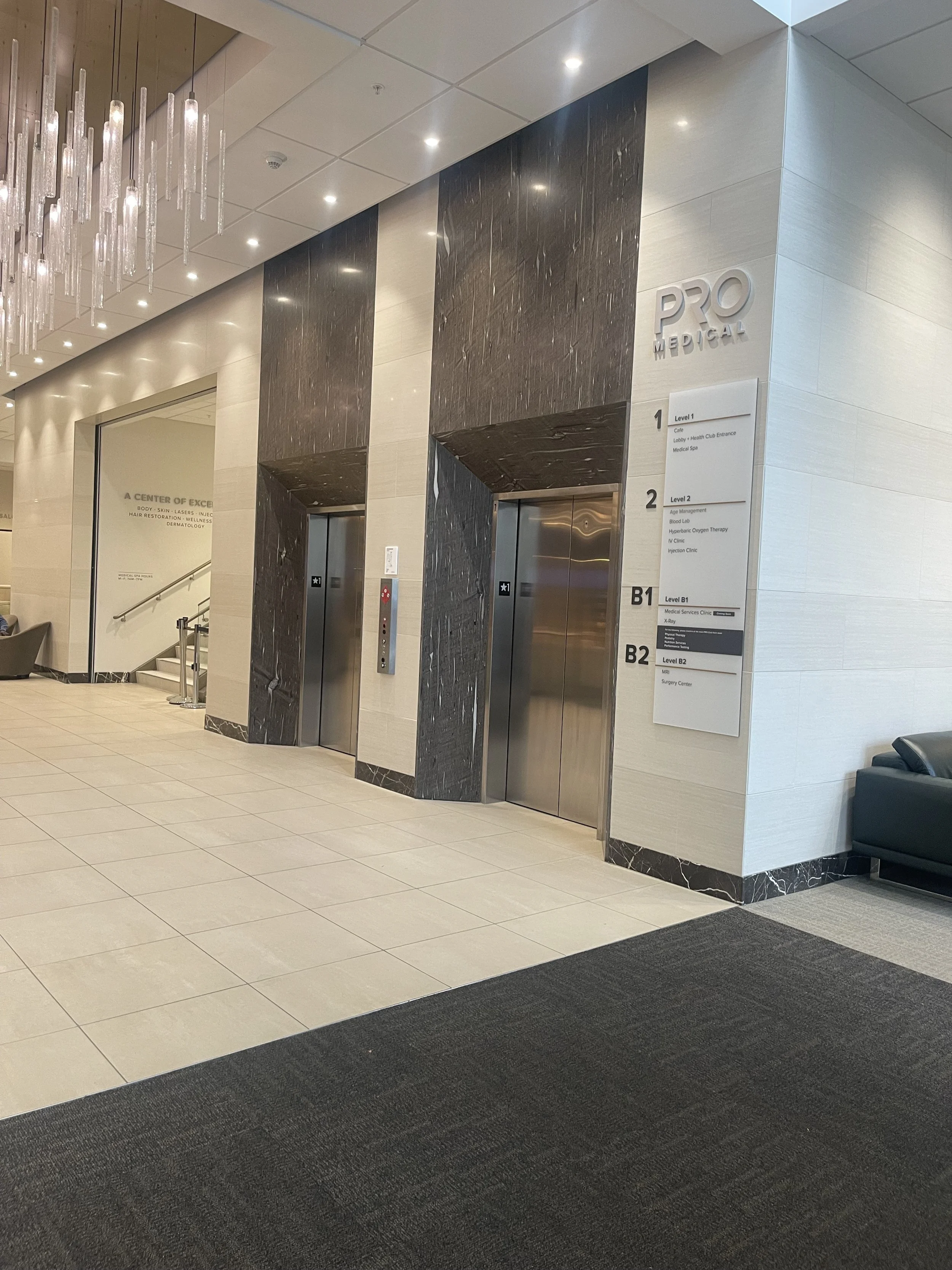 Commercial-scale stone cladding for the Pro Medical elevator lobby in Bellevue, showcasing heavy-profile architectural integration and precise reveals.